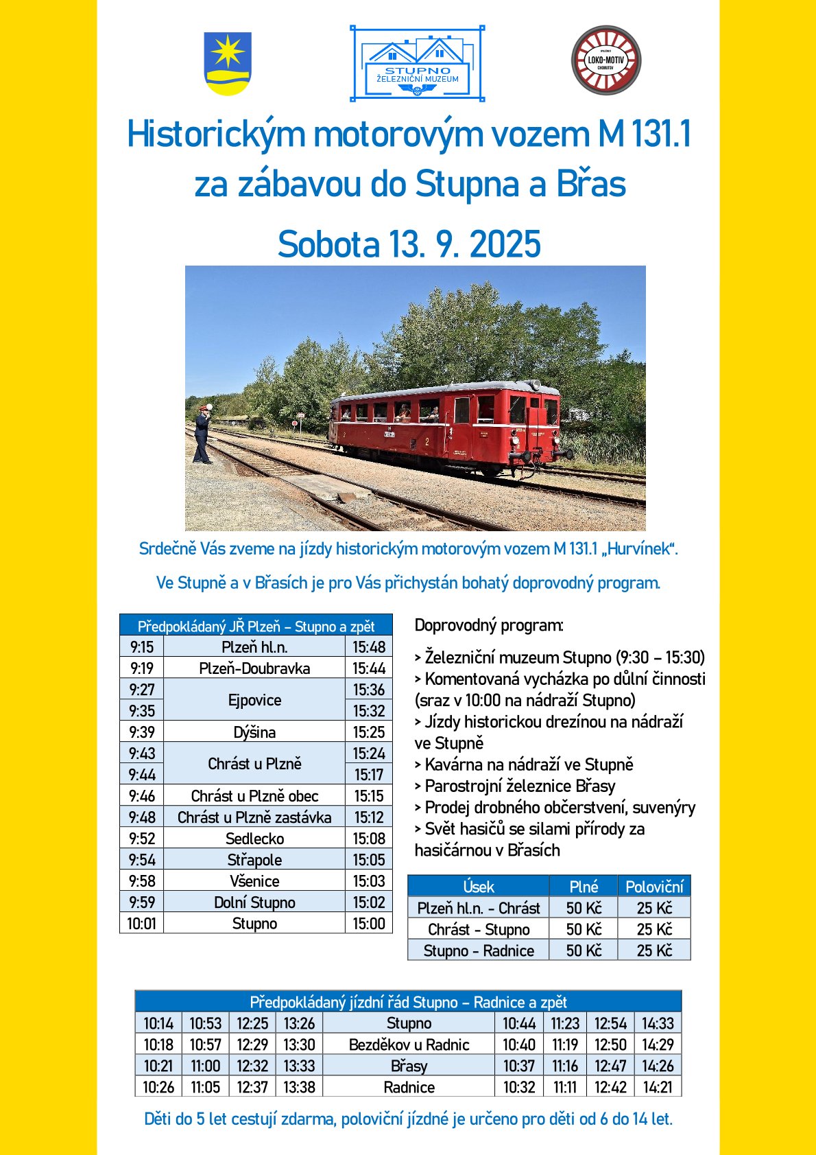 Am Samstag, dem 13. September, fuhr Hurvínek morgens von Pilsen los. Wir fuhren durch den längsten tschechischen Tunnel nach Ejpovice, dann auf der ehemaligen Hauptstrecke nach Chrást u Plzně und weiter auf der Nebenbahn nach Stupno. Im Laufe des Tages besorgten wir vier Zugpaare zwischen den Bahnhöfen Stupno und Radnice, am Nachmittag kehrten wir nach Pilsen zurück.