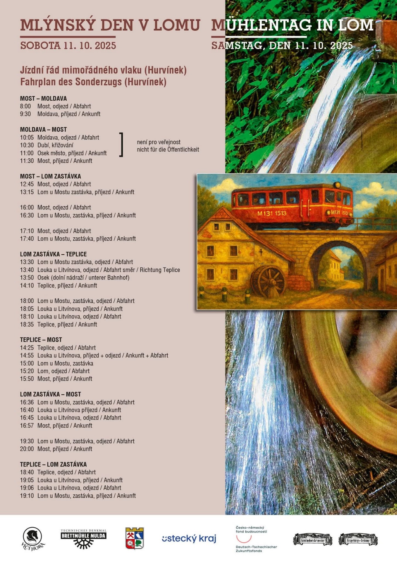 Der Verein Vlčí hora aus Lom u Mostu organisierte Mitte Oktober einen Mühlentag. Im Mittelpunkt der Festlichkeiten stand die Werner-Mühle, die unweit des Bahnhaltepunkts steht. Die Organisatoren nutzten die Nähe zur Moldau-Bahn und luden unseren Hurvínek M131.1513 zu der Veranstaltung ein.