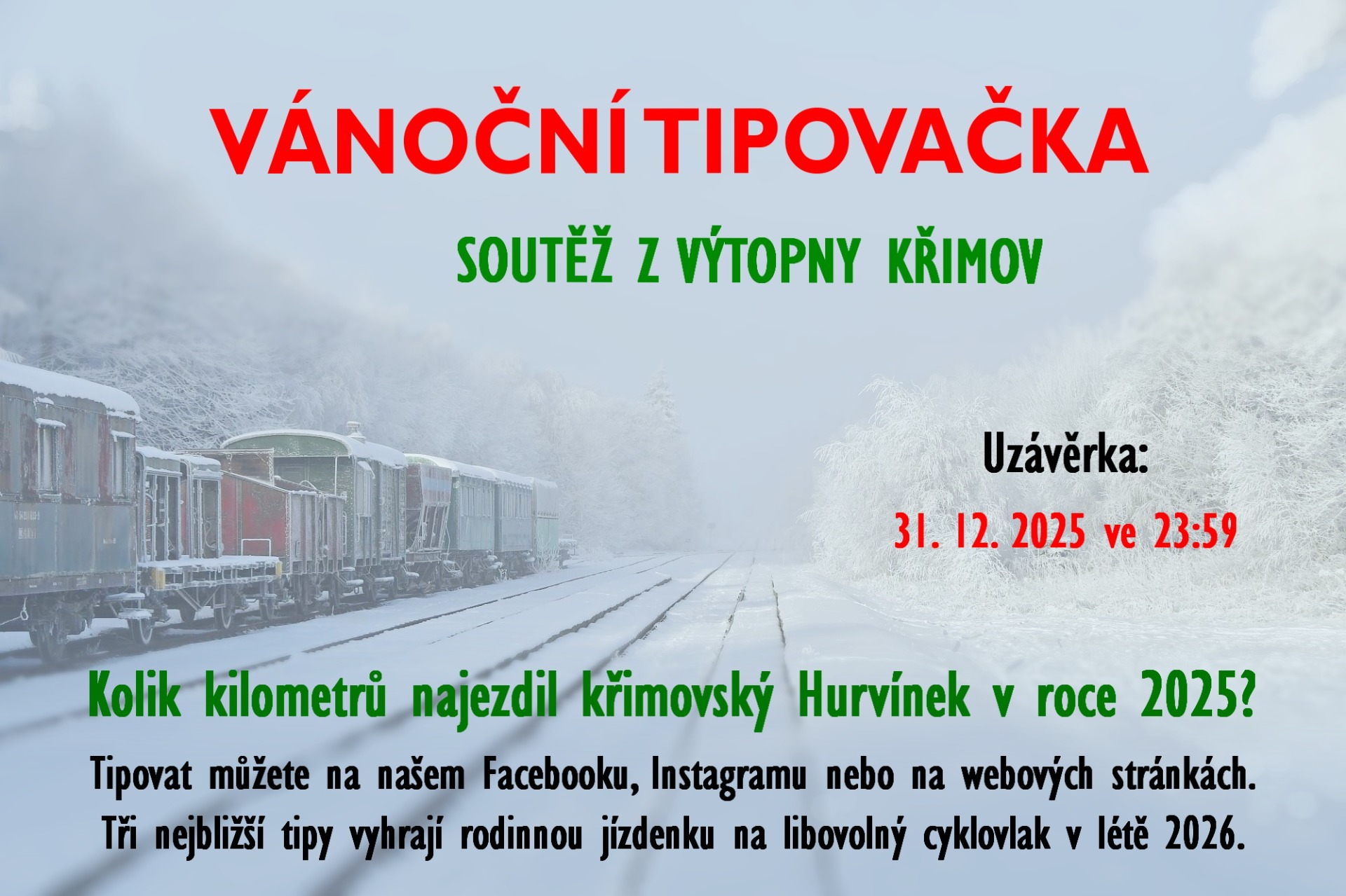 Tipujte a vyhrajte rodinnou jízdenku na cyklovlak! Zapojte se do naší vánoční soutěže a odpovězte na soutěžní otázku. Tři nejpřesnější tipy odměníme rodinnou jízdenkou na jeden libovolný cyklovlak pořádaný naším spolkem v létě 2026.